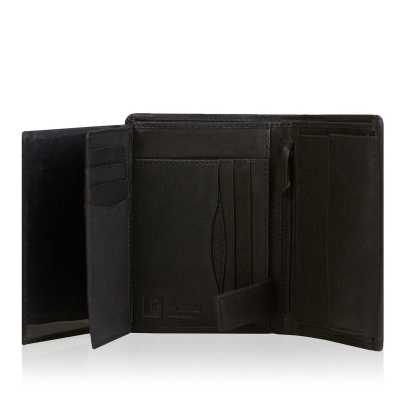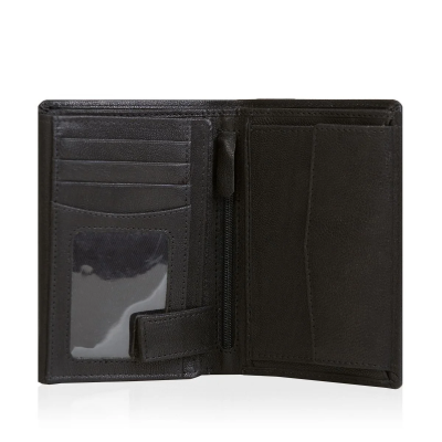 An elegant leather wallet, decorated with the embossed logo Słoń Torbalski– high quality combined with practicality. It has a universal, simple style and a classic cut, which is why it is suitable for all men, regardless of preferences. It fits well in the hand, and its skin is natural, soft and has a delicate texture. It is a medium-sized wallet, while its interior is well organized, so the wallet can hold a lot. It has a double compartment for banknotes, pockets for cards and other documents and a special pocket for coins. In addition, it has a zipped, fold-out panel with transparent pockets and further pockets for cards and small items. It also has an additional RFID function, that protects cards against data theft. The wallet is in a vertical orientation, folds in half and has no clasp.