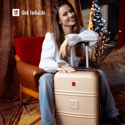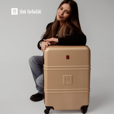 This is a travel suitcase distinguished by a metal, colorful logo of Słoń Torbalski and embossed decorations. This ultra-light suitcase weighs only 3,7 kg and has a capacity of 70 l. This is a medium sized hard case made of ABS material.