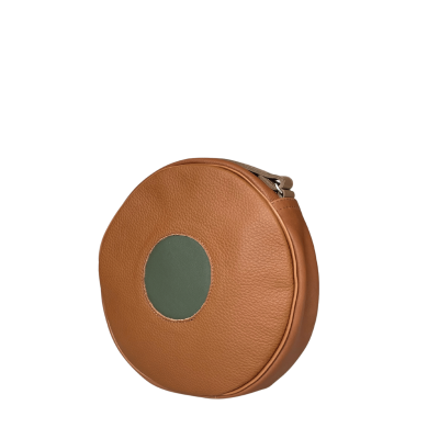 This version comes in a classic camel tone throughout, making it a versatile accessory for a wide range of outfits. The front features a decorative circular insert in rich bottle green, adding a touch of contrast and personality.